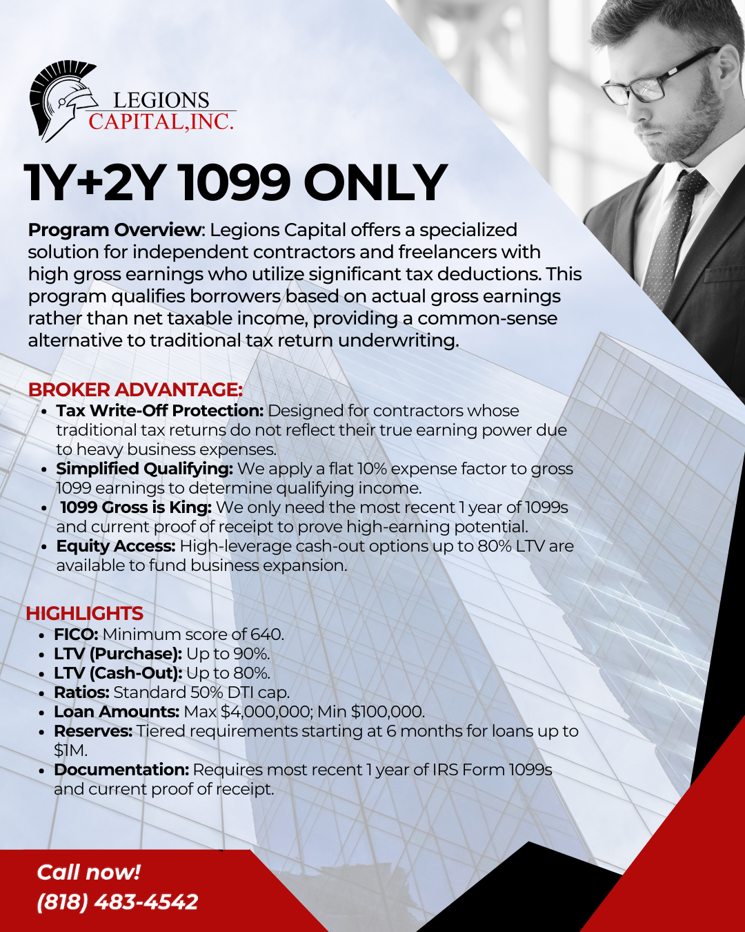 Legions Capital offers a specialized solution for independent contractors and freelancers with high gross earnings who utilize significant tax deductions. This program qualifies borrowers based on actual gross earnings rather than net taxable income, providing a common-sense alternative to traditional tax return underwriting.