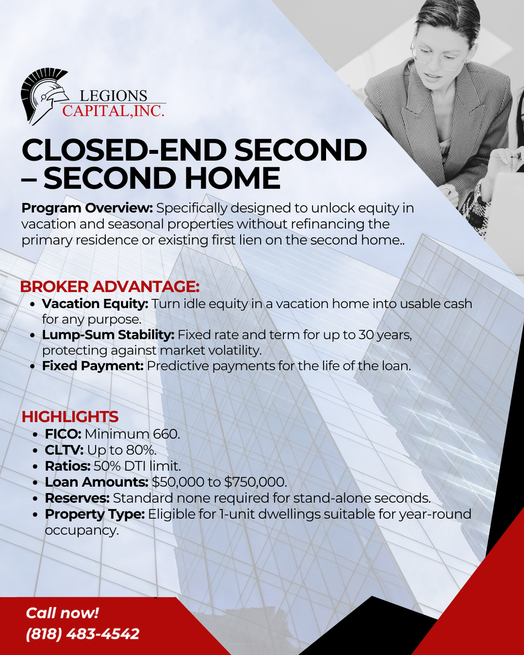 Specifically designed to unlock equity in vacation and seasonal properties without refinancing the primary residence or existing first lien on the second home.
